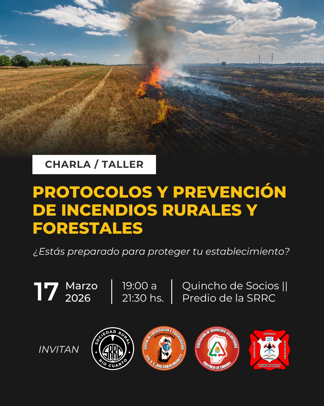 El pasado 17 de marzo se llevó a cabo una charla–taller sobre protocolos y prevención de incendios rurales y forestales, en el Quincho de Socios del predio de la Sociedad Rural de Río Cuarto.